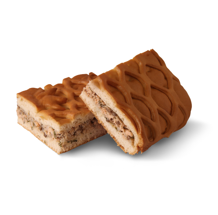 Состав продукта начинка (рыба горбуша, лук репчатый, грибы, майонез 67%, рис, масло растительное (подсолнечное), соль, укроп свежий, перец черный молотый), мука пшеничная хлебопекарная высшего сорта, вода питьевая, маргарин, сахар, яичные продукты, дрожжи хлебопекарные сухие, соль, комплексная пищевая добавка, ароматизатор.